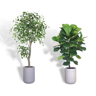 The CG Hunter Faux Fiddle Leaf Fig and Ficus Tree set feature premium artificial indoor trees. Lifelike-leaves and hand painted trunks create a realistic appearance. High-quality artisan textured planter pots included with purchase.