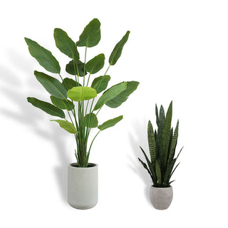 Elevate your interior decor with the stunning CG Hunter 8' Bird of Paradise and 40" Snake Plant, artfully placed in sleek modern planters. These lifelike artificial plants are meticulously crafted to mimic the natural beauty of the real Bird of Paradise and Snake Plant. Perfect for both residential and commercial spaces, they offer a touch of tropical elegance without the need for maintenance.