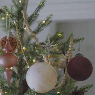 4" Set of 4 - Enhance your holiday decor with our Set of 4 handcrafted mouthblown Mercury Marble Glass Ornaments. Crafted from cream-colored glass and showcasing a marbleized finish, these 4-inch beauties come with natural jute hangers and bronze antique toppers, adding a touch of charm from around the world to your tree.