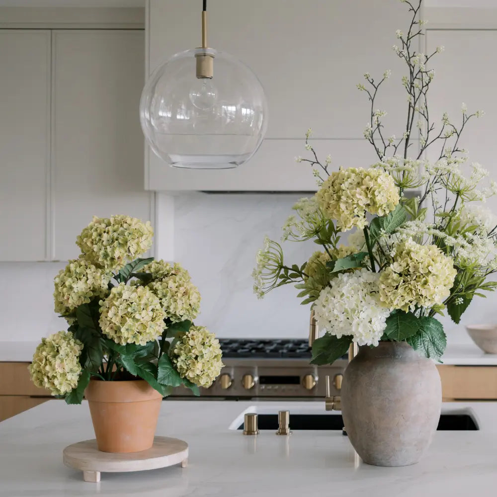 Set in a simple pot with a natural finish, this hydrangea plant blends seamlessly into a variety of interiors—from modern and transitional to traditional and coastal. Its compact yet full silhouette makes it ideal for styling on consoles, dining tables, kitchen counters, entryway surfaces, or built-ins, where it adds softness without overwhelming the space.