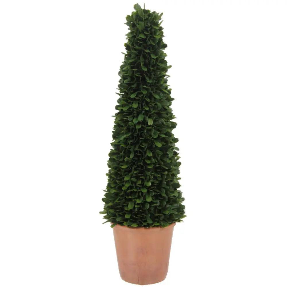 The 24" Artificial Boxwood Plant in Tapered Pot delivers a refined take on traditional topiary with a clean, modern silhouette. Featuring dense, layered foliage in rich green tones, this piece captures the fullness and texture of real boxwood while maintaining a sculptural, design-forward presence. Its tapered form adds vertical interest, making it a strong yet elegant focal point in any room.