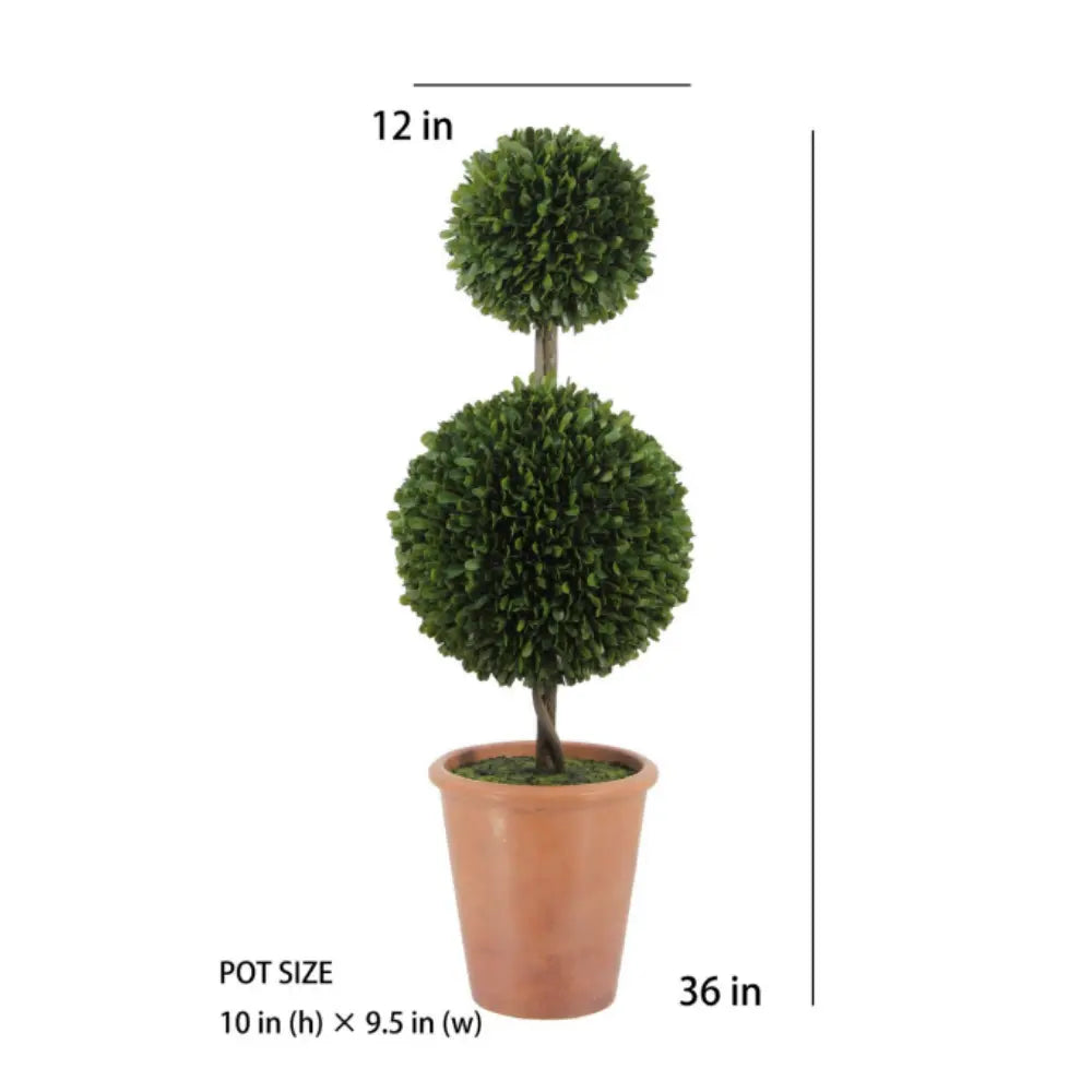 The 36" Artificial Double Boxwood Topiary in Pot offers a polished interpretation of traditional garden design with a modern, interior-friendly sensibility. Featuring two perfectly rounded boxwood spheres, this piece showcases dense, layered foliage with rich green tones that create depth, texture, and remarkable realism. The structured silhouette adds instant order and sophistication to any space it occupies.