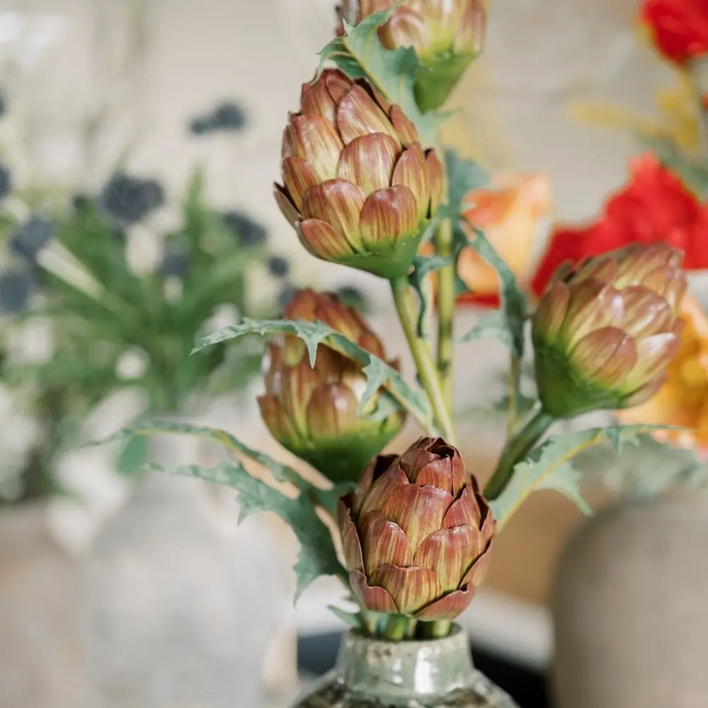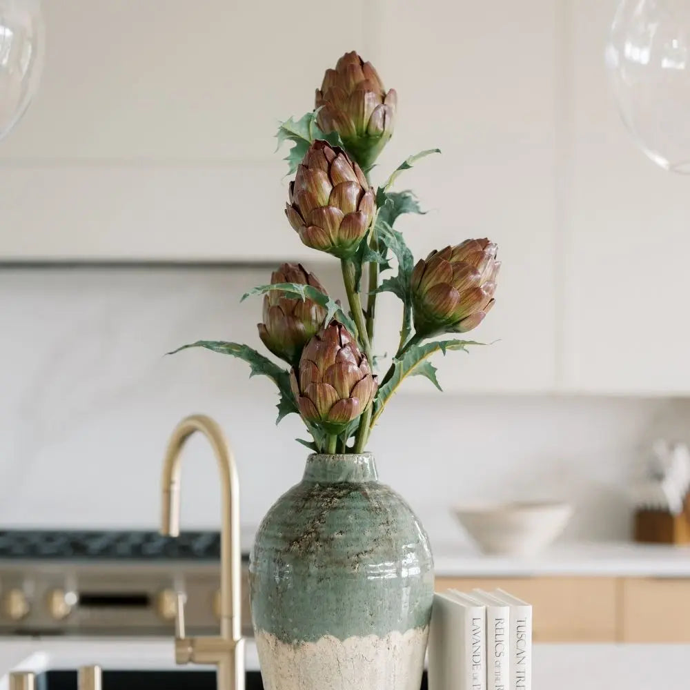 Completely maintenance-free, this faux artichoke bouquet requires no water, shedding, or upkeep, remaining beautifully styled year-round.