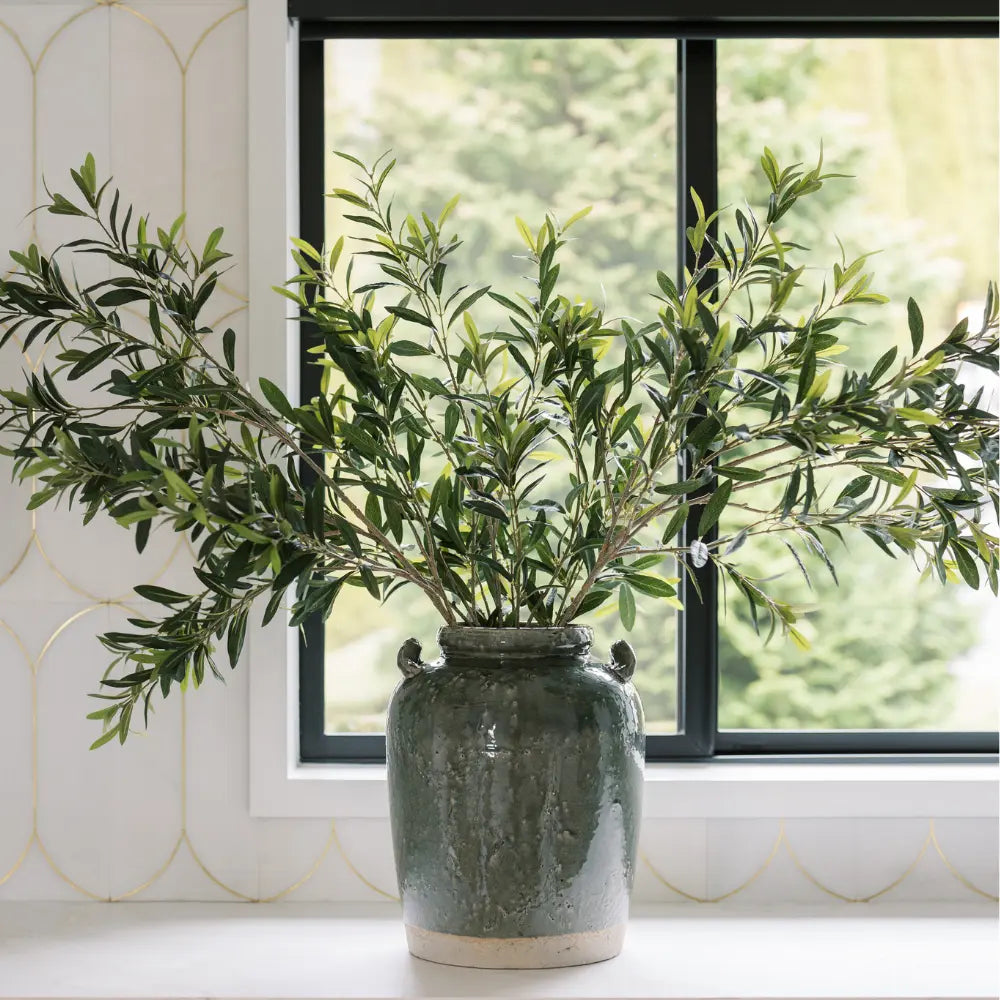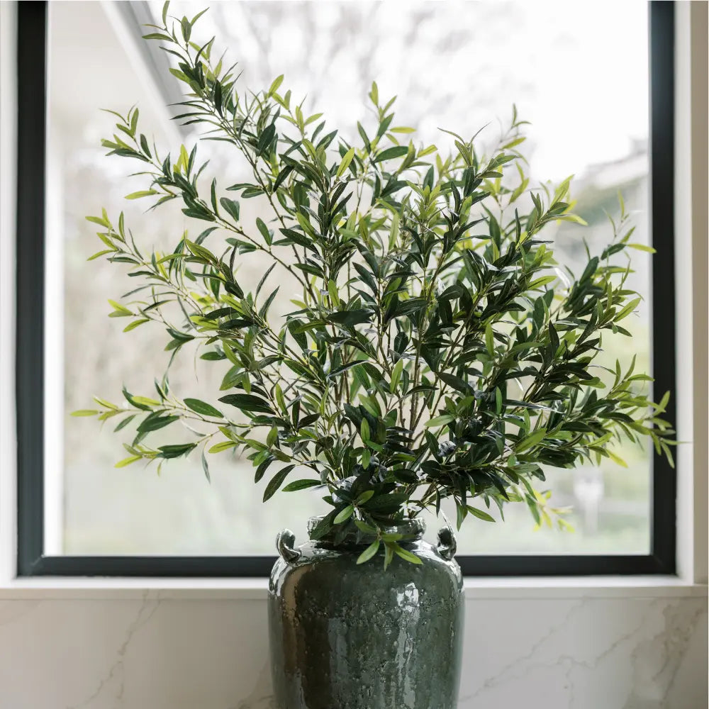 A 48" faux olive branch bouquet featuring three elongated stems that mimic nature with soft green tones and organic movement. Designed to bring height, calm, and understated elegance to elevated interiors.