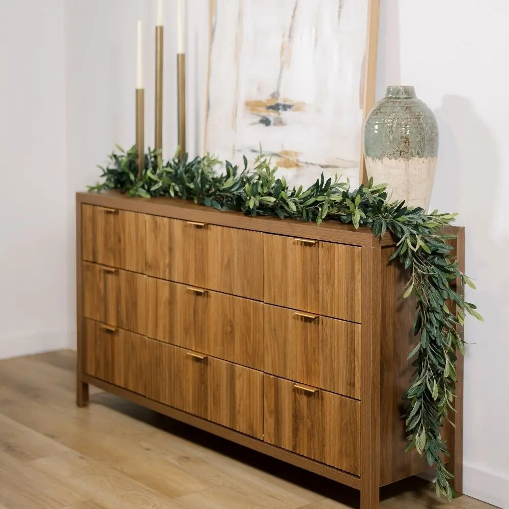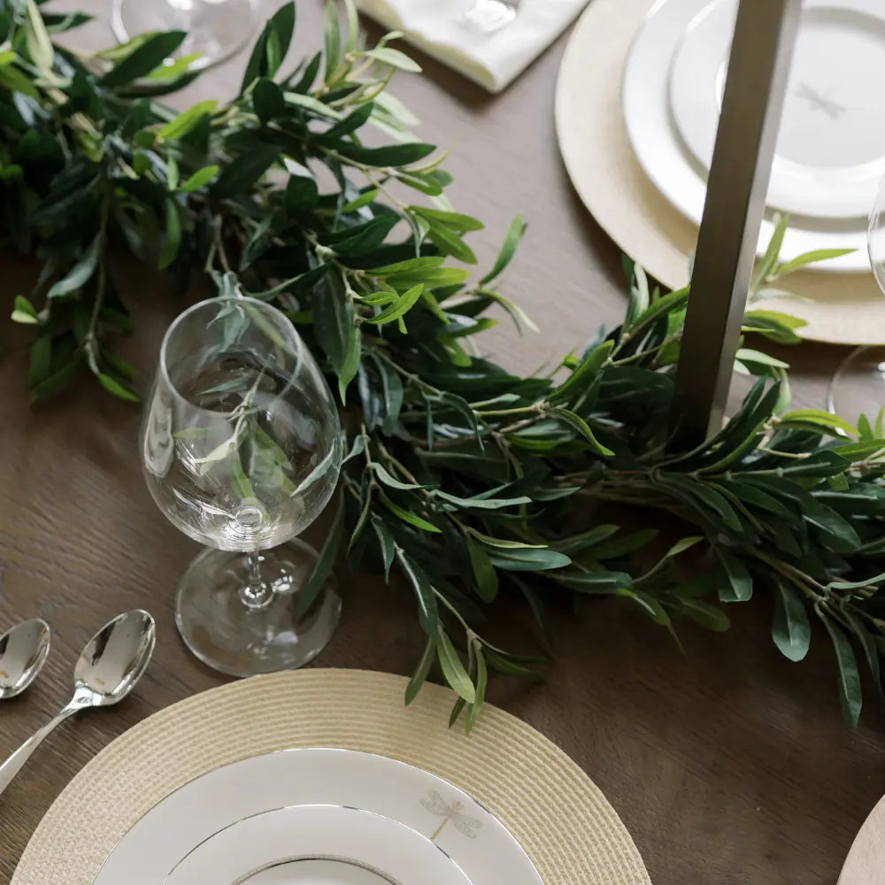 Its generous length makes it exceptionally versatile. Drape it across a fireplace mantel, style it down the center of a dining table, weave it along shelving, or frame doorways and stair rails for a layered, architectural effect. The olive leaf silhouette pairs beautifully with modern, Mediterranean, coastal, and transitional interiors, offering warmth without visual heaviness.