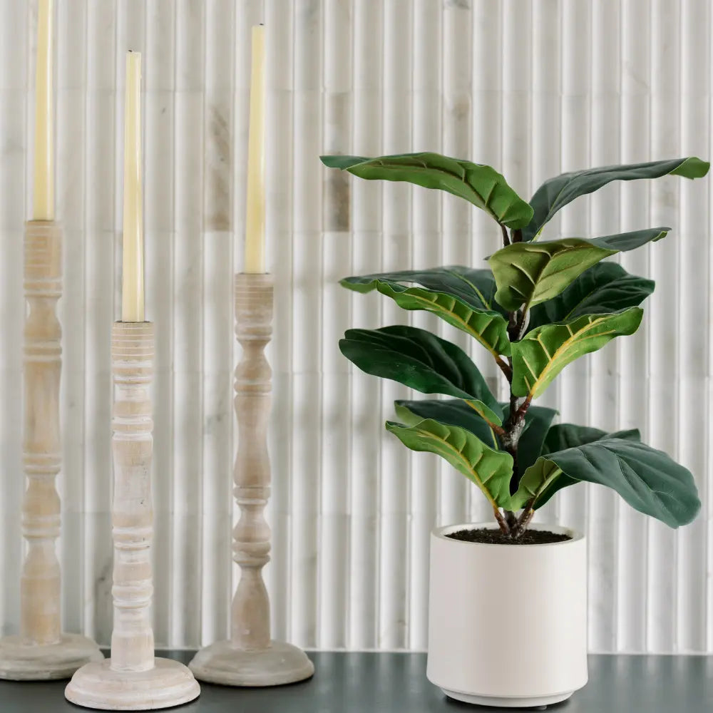 The 2' Artificial Fiddle Leaf Fig Tree in Pot delivers the signature look of this iconic plant in a perfectly scaled, design-forward form. Featuring broad, veined leaves with rich green tones and subtle variation, this piece captures the layered beauty and realism of a mature fiddle leaf fig while maintaining a clean, sculptural silhouette. The natural-look trunk and thoughtful leaf placement create depth and authenticity from every angle.