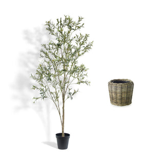 Our 7' Wispy Olive Tree pairs perfectly with our large French Rattan Basket. The tree's designer details stem from trunk to leaf leaving even your guests questioning its lifelike appeal. Elevate your space with this designer faux greenery masterpiece, meticulously crafted to bring the allure of an olive orchard into your home or office.