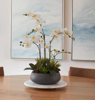 Every element of the orchid and succulent arrangement is thoughtfully handcrafted to create a stunning visual display that is sure to impress. The lifelike petals and carefully arranged succulents evoke a sense of natural beauty, bringing the tropics indoors. While it works for any space it is the perfect centerpiece for tables indoors or covered outdoors.